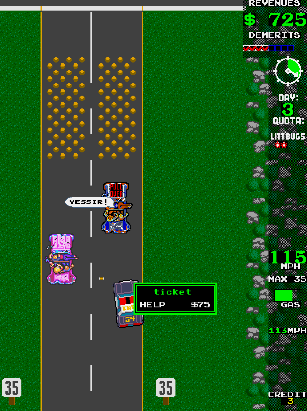 Players take on daily patrols with specific ticket quotas to meet—often requiring you to arrest litterbugs, speeders, hitchhikers, or armed robbers. The game mixes driving skills with rapid reaction time and resource management.