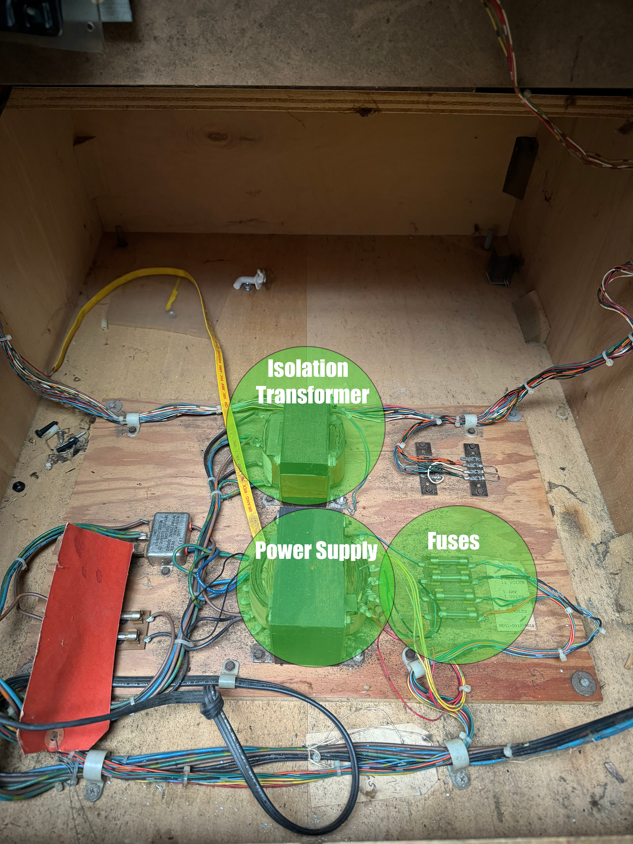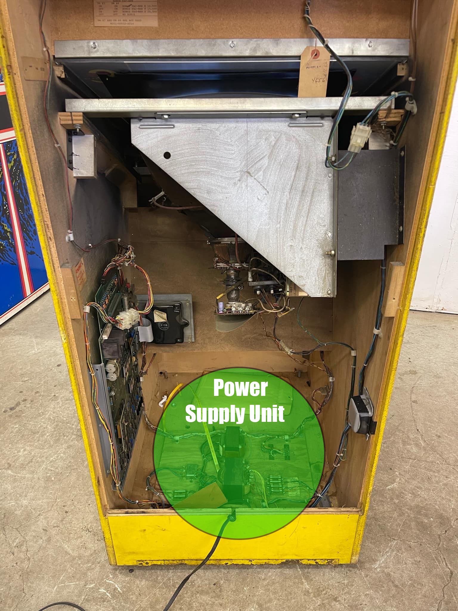 - Converts high-voltage AC from the wall into a lower voltage needed by the arcade components.