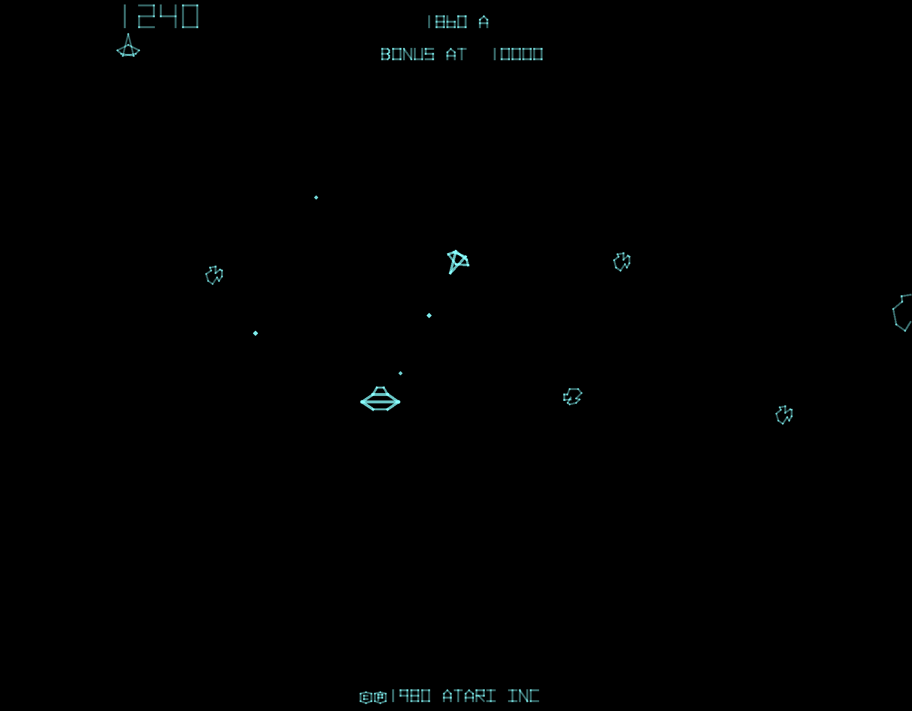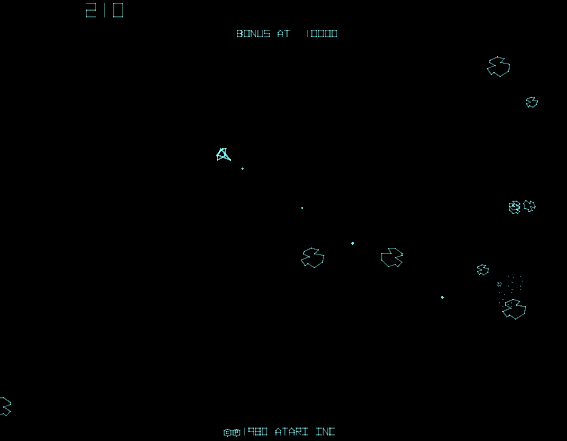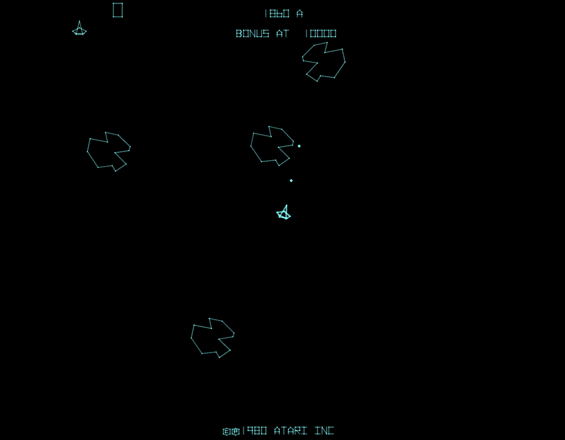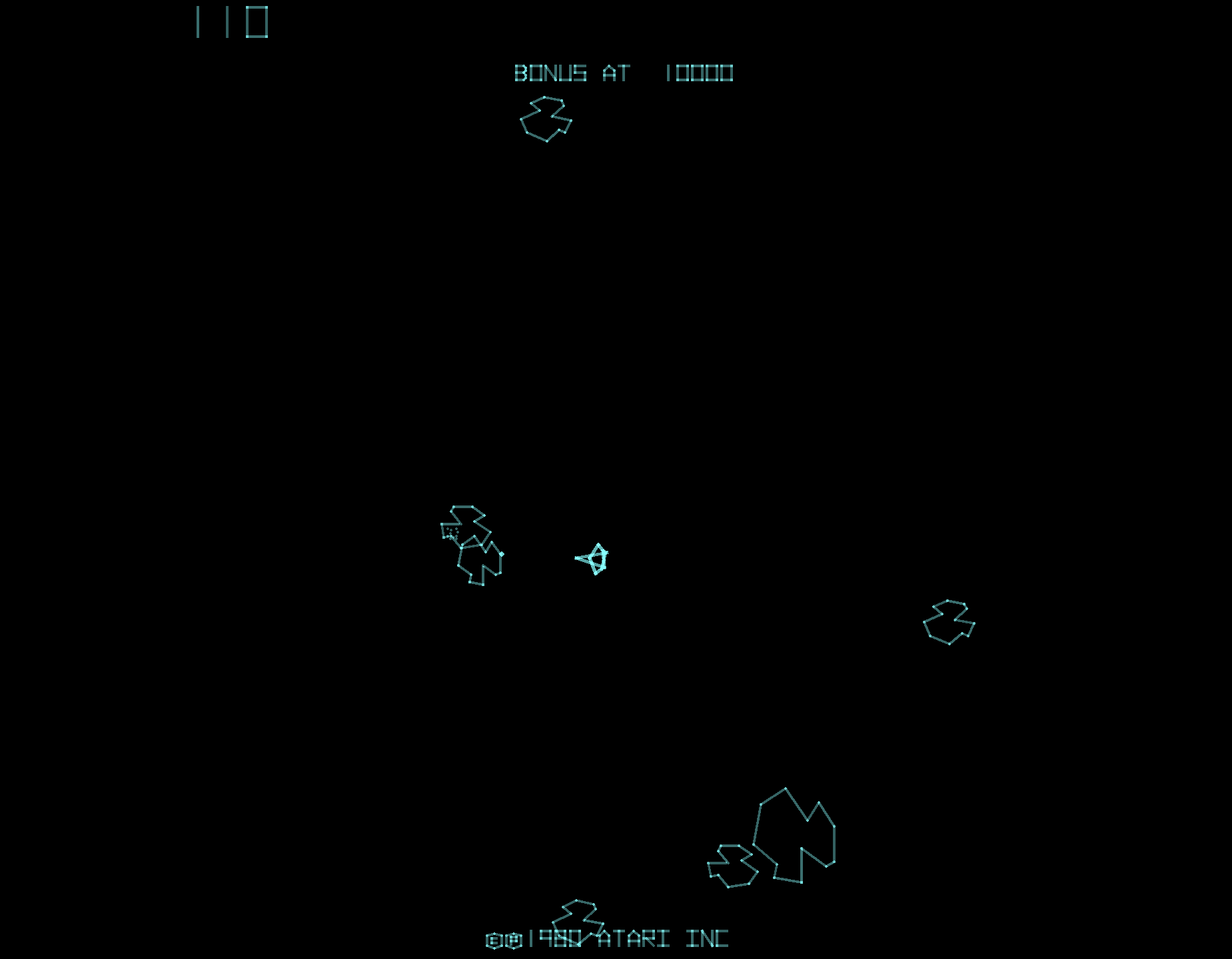 Players control a triangular spaceship in a wraparound 2D space field. The objective is to shoot and destroy asteroids and enemy ships without crashing or being hit.
