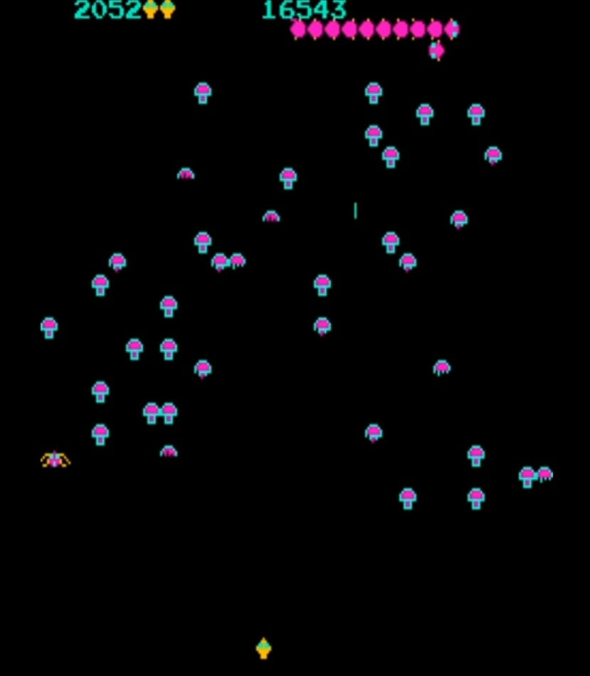The combination of the centipede splitting into smaller segments and the random movements of other enemies creates a dynamic and unpredictable challenge.