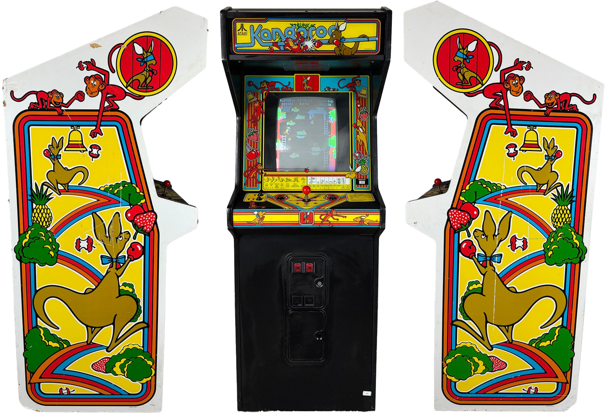 The original arcade cabinet featured bright artwork of the boxing kangaroo and her baby, with gameplay designed around simple but tight platforming mechanics and a one-button punch control system.