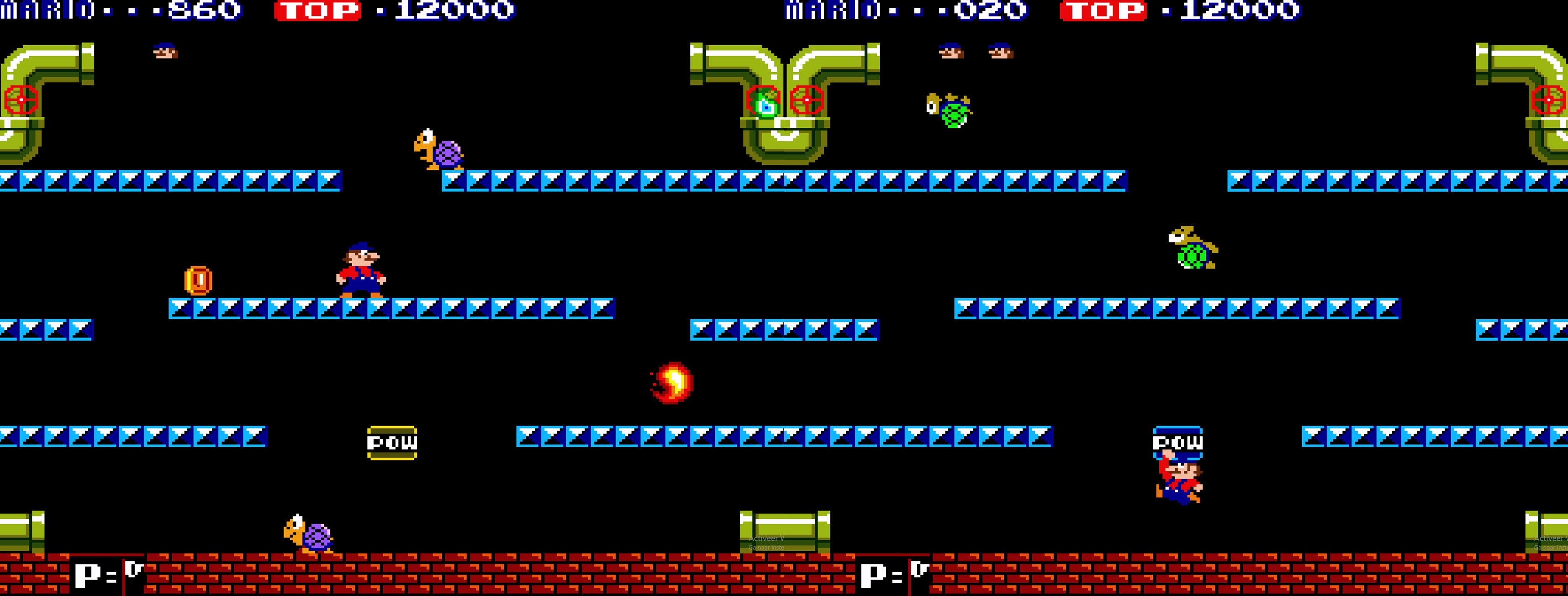 In Mario Bros, players control Mario and Luigi as they navigate a single-screen stage, battling enemies that emerge from pipes. The goal is to clear each stage by defeating all the enemies while avoiding hazards like fireballs and icicles.