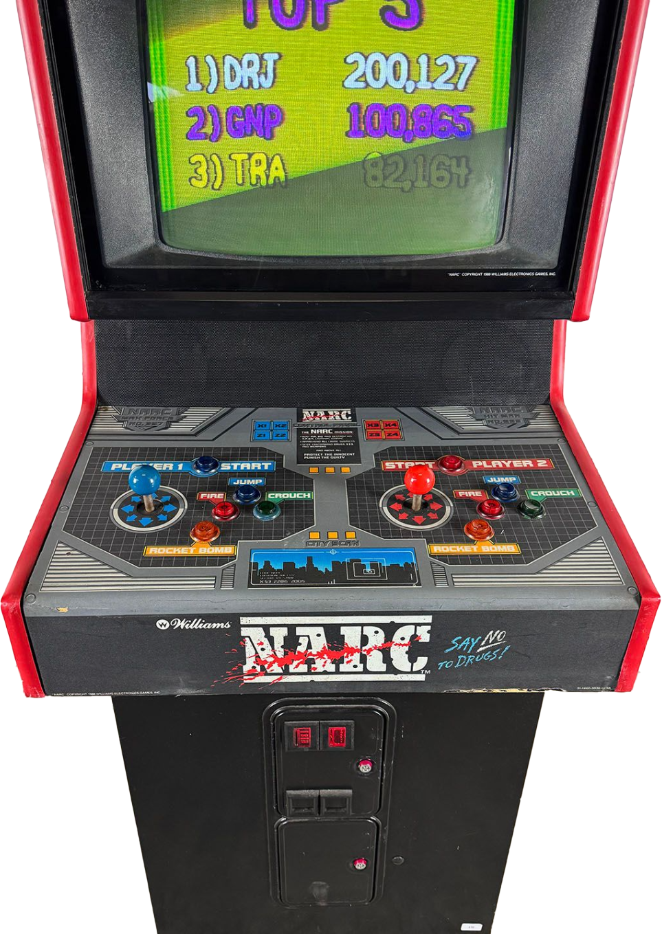 Released by Williams Electronics in 1988, NARC was one of the most violent and visually striking arcade games of its era. As one of the first ultra-violent video games to hit arcades, it combined digitized graphics, intense run-and-gun action, and a heavy-handed “War on Drugs” theme. Players took on the role of high-tech narcotics agents in a dystopian crime-ridden city, blasting criminals and seizing drugs with over-the-top firepower.