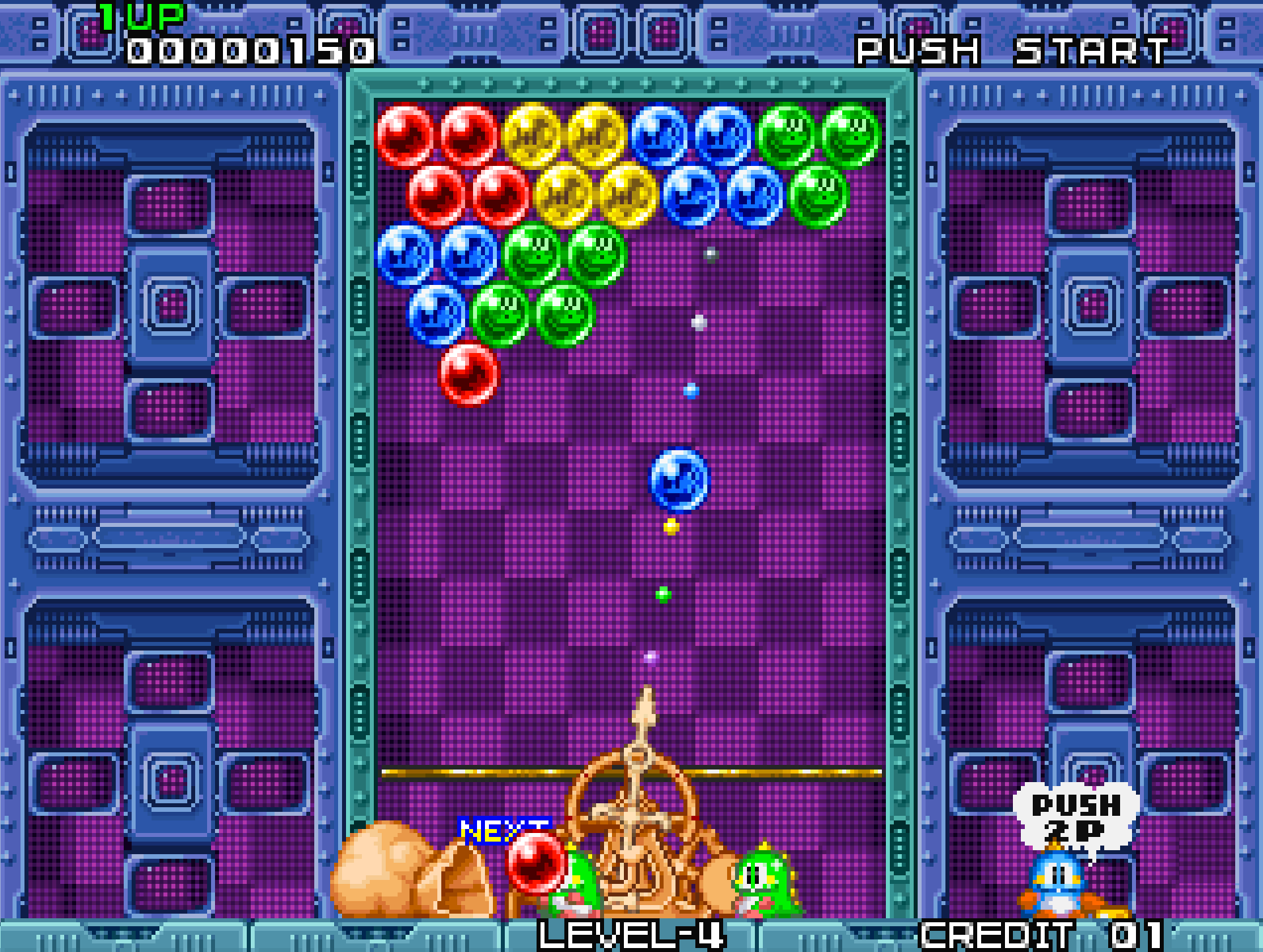 Taito developed Puzzle Bobble using characters and sprites from Bubble Bobble (1986), giving fans of the earlier game something both familiar and entirely new. The game was designed to be instantly accessible but deceptively strategic, and it debuted on Taito’s F3 System hardware.