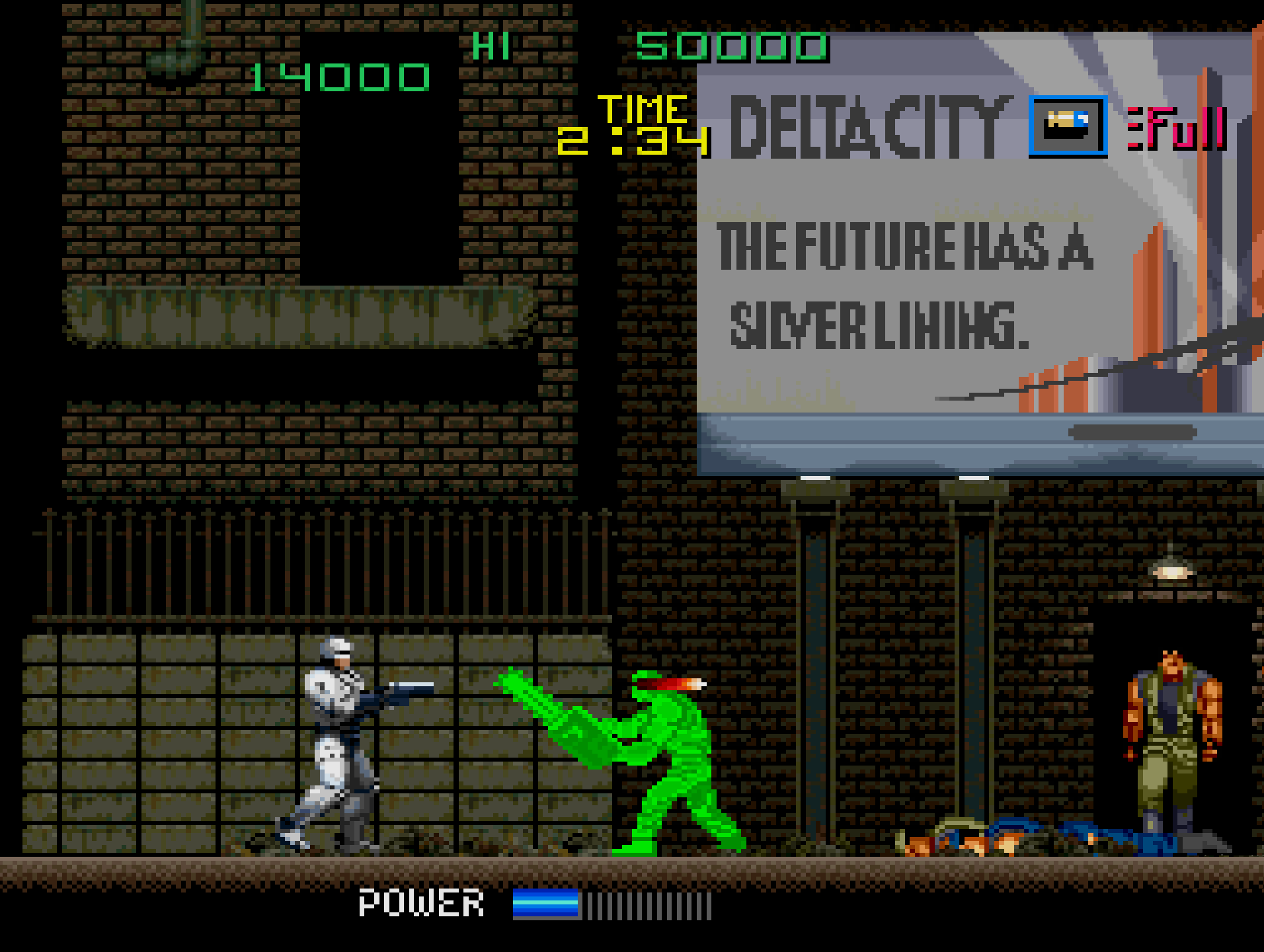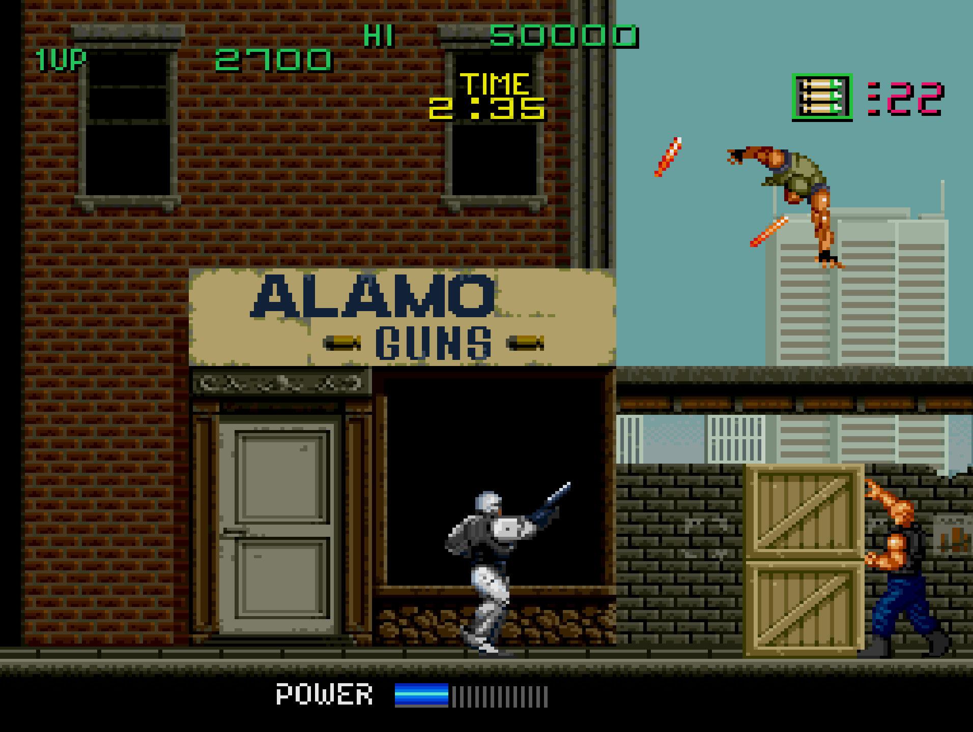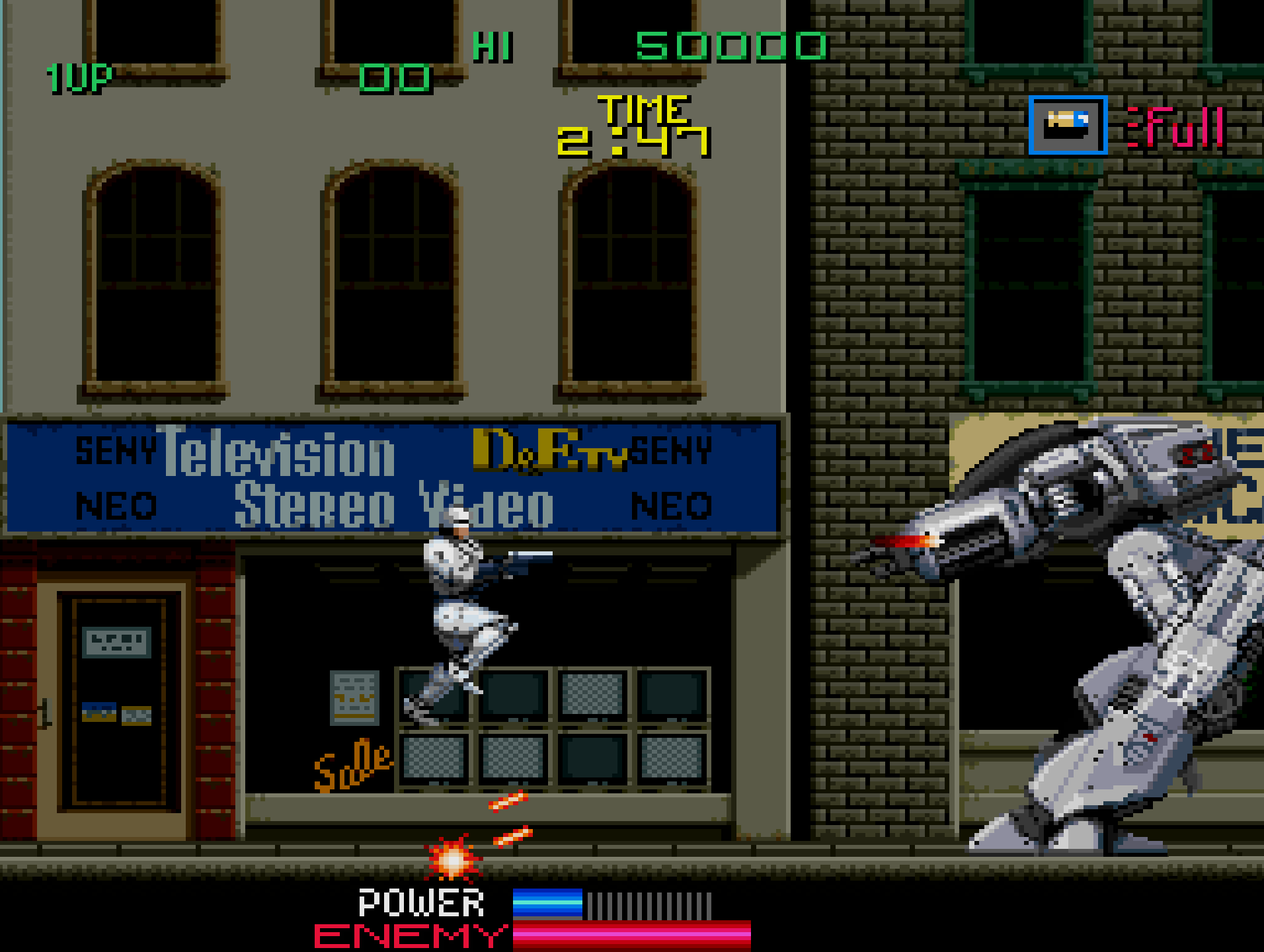 - Side-Scrolling Action – Players control RoboCop, progressing through crime-ridden streets while eliminating enemies.