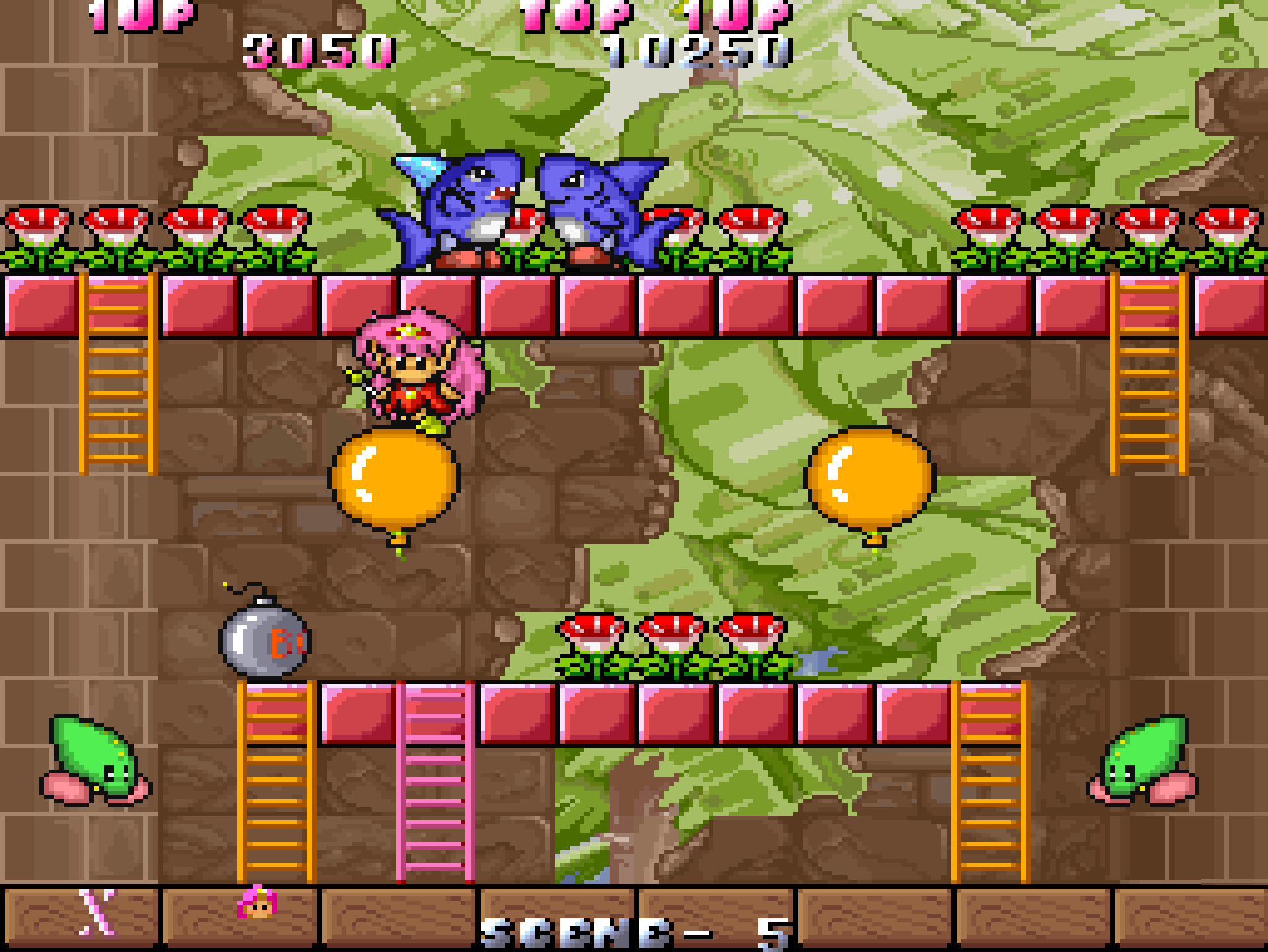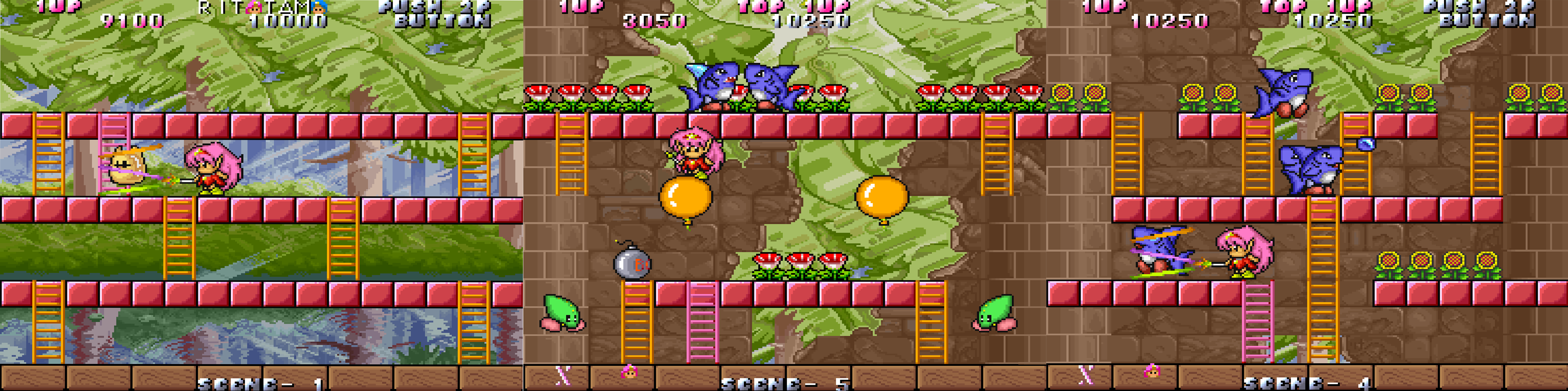 Players guide Tam and Rit through a series of single-screen levels, using their magical rods to defeat enemies and navigate obstacles. Key gameplay elements include: