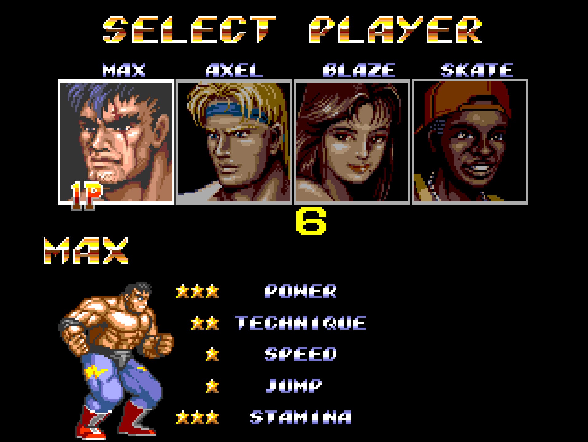- Character Roster: Choose from four distinct fighters—Axel Stone, Blaze Fielding, Max Thunder, and Eddie "Skate" Hunter—each with unique fighting styles and special moves.