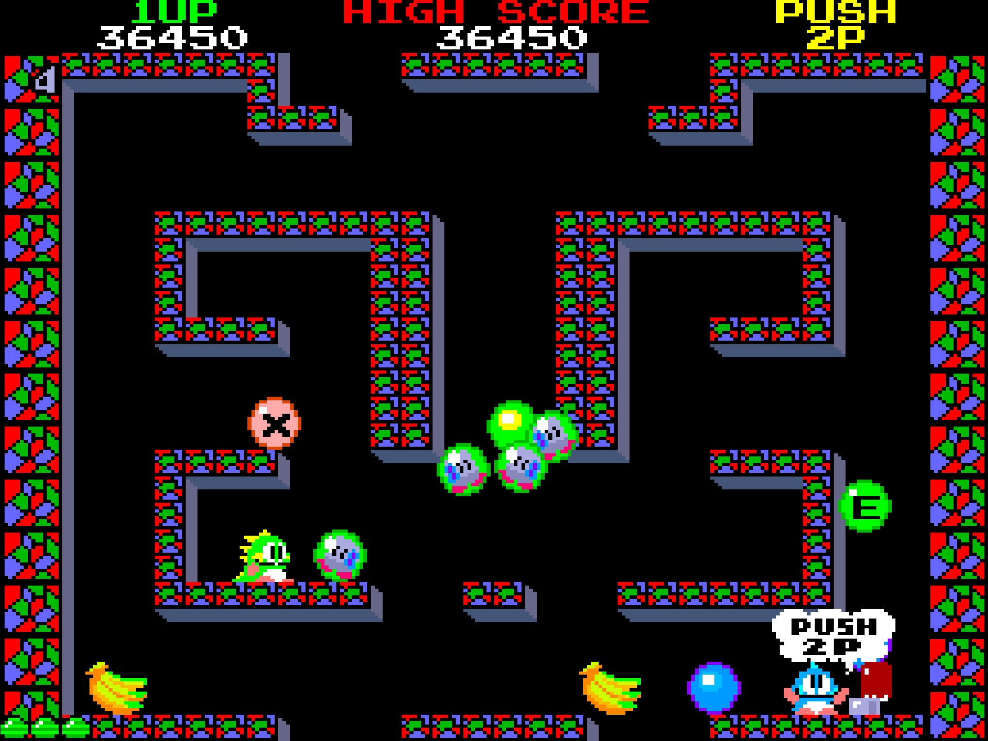 Don’t let the adorable dinosaurs Bub and Bob fool you—Bubble Bobble is one of the most competitive and strategic co-op arcade games ever made. Players had to trap enemies in bubbles, pop them, and collect fruit for points.