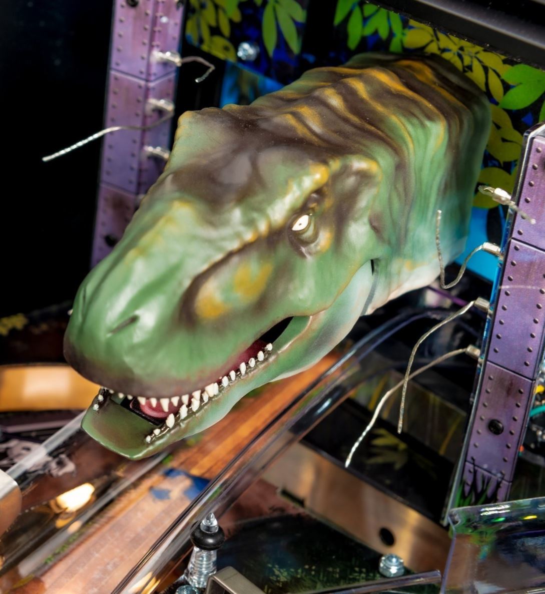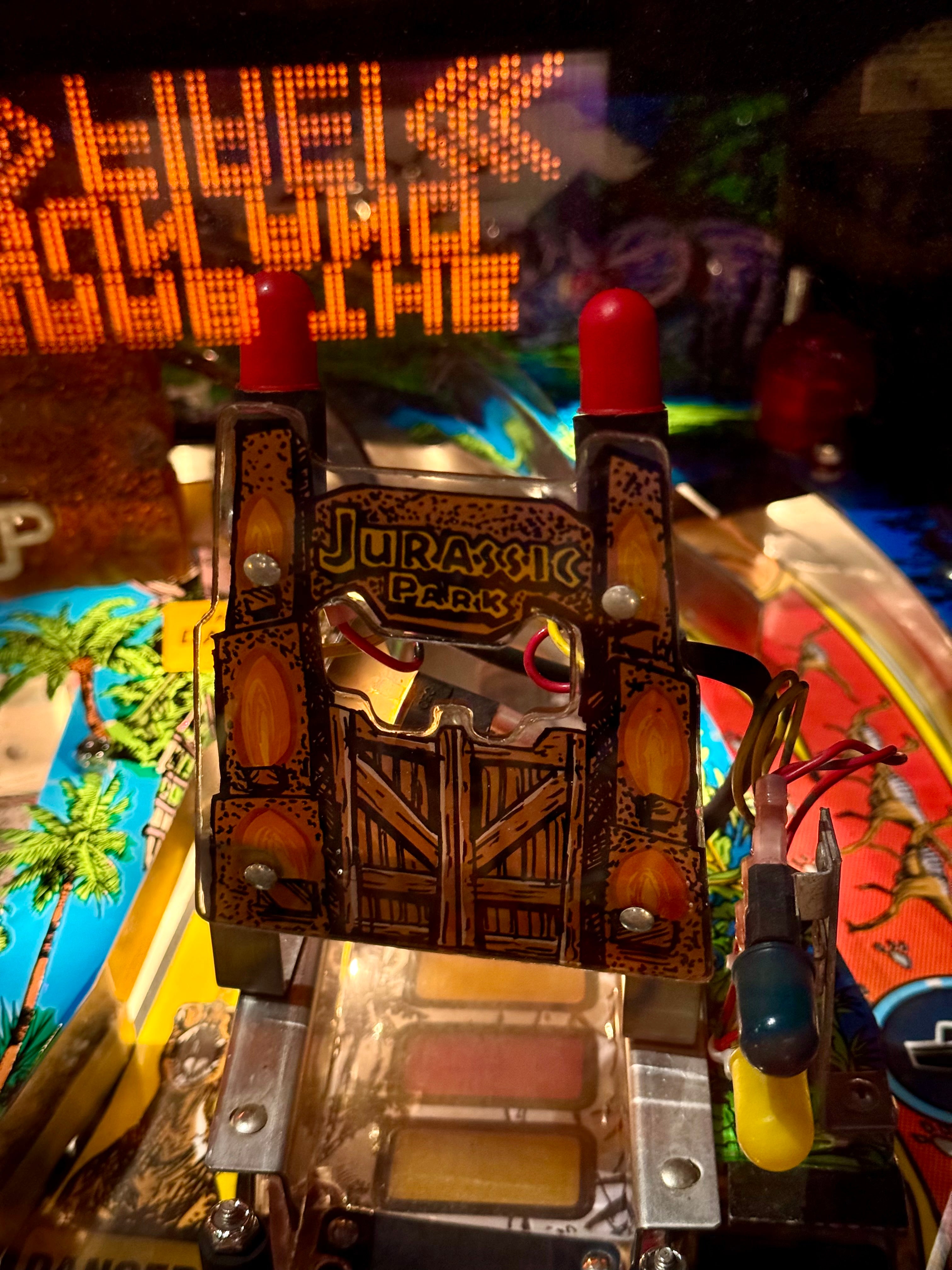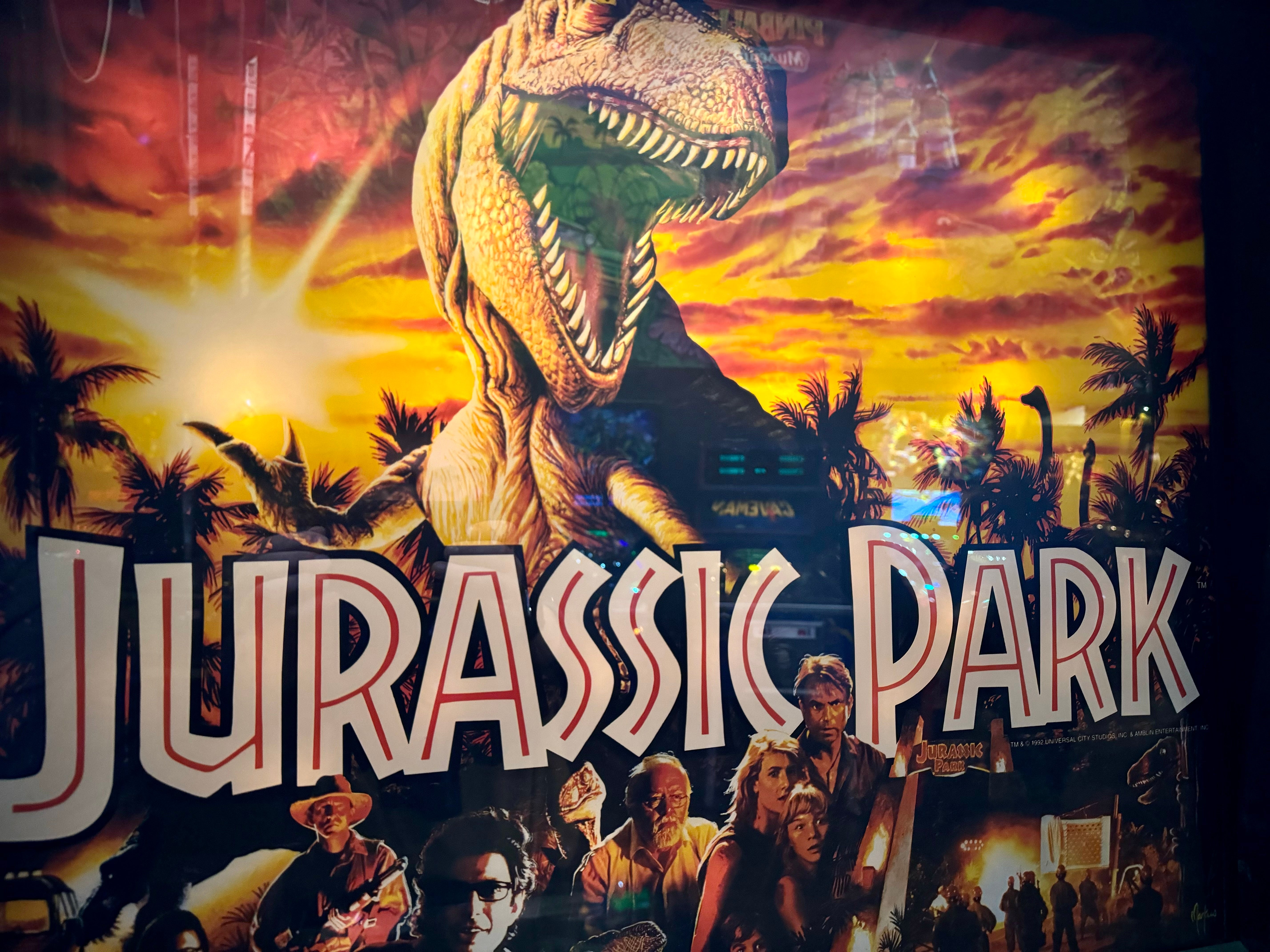 The 1993 version of Jurassic Park pinball, designed by Dennis Nordman, was released at a time when pinball machines were brimming with colorful artwork, playful toys, and mechanical ingenuity. The game’s design reflects the early ‘90s style of Williams, with vibrant, hand-drawn artwork, bold colors, and a deep focus on mechanical toys, including the now-iconic T-Rex toy at the center of the playfield. The T-Rex is a mechanical element that "eats" the ball, adding a fun and interactive feature to the game. It is a standout example of the innovative toys Williams was known for during this era.